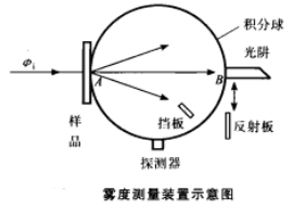 雾度和透光率是透明薄膜材料两项重要的指标。雾度(也称朦胧度)H还是入射光透过样品后偏离入射方向一定角度以上的漫透射通量与总透射通量的比值。雾度常用于描述透明薄膜材料的漫射特性。对漫透射光偏离入射光的角度一般规定为大于2.5,但是也有规定为其他角度的。ASTM D1003中对有关雾度测定、显示方法做了详细规定。