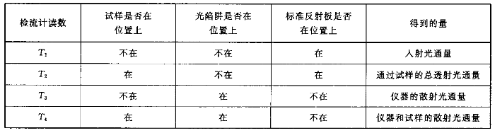 调节雾度计零点旋钮,使积分球在暗色时检流计的指示为零。当光线无阻挡时,调节仪器检流计的指示为100,然后按下表操作,读取T1、T2、T3和T4。