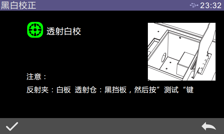 3.黑校完成后自动进入透射白校界面,根据提示取出黑板(放置相应的参照物或什么都不放),然后按测量键进行白校正,或点击“”取消并退出校正。