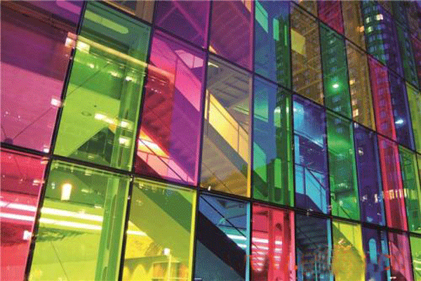 玻璃色彩丰富,赤、橙、黄、绿、青、蓝、紫,无一不有。如今的建筑多姿多彩、风格各异,玻璃多色性的应用可谓独占其功。颜色玻璃就好像是画家手中的颜料,任由建筑设计师创造性地应用。现代化的建筑物充分地发挥玻璃的多色性,如各种颜色玻璃门、窗、幕墙等;特别是玻璃的多色性在室内装饰上得到淋漓尽致的发挥,如彩色玻璃隔断、彩色玻璃屏风、彩色玻璃画、彩色玻璃天顶、彩色玻璃栏杆等。