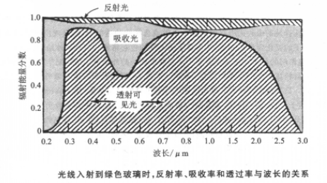 从本质上讲某种物质对光的选择性吸收,是吸收了连续光谱中的特定波长的光子,以激发吸收物体本身原子的电子跃迁。在固态条件下由于原子的相互作用,能级分裂,发射光谱线变宽。同理,吸收光谱的谱线也要变宽,成为吸收带或有较宽的吸收区域,剩下的就是较窄的,即色调较纯的反射或透射光,例如,当光线照射到一块绿色玻璃上时,其反射率、透射率和吸收率与波长的关系如下图所示。由图可见,对于波长为0.4μm的光波,其反射率和吸收率分别各为0.05,而透过率却为0.90。电子受激跃迁造成吸收,但当从激发态回到低能态时,又会重新发射光子,其波长并不一定与吸收的波长相同,因此,透射光的波长分布是非吸收光波和重新发射光波的混合波。透明材料的颜色是由混合波的颜色决定的。