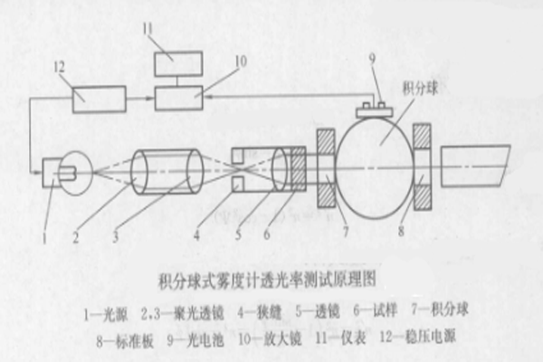 从光源1发出的光,经过聚光透镜2、3、狭缝4,经过透镜5变成平行光,平行光通过滤光器后射到试样上,射到试样上的光有一部分在表面进行反射,另外一部分平行透过试样和扩散透过试样,然后进入积分球。设平行透过的光通量为φ2,用设置在积分球出口处的标准板8求出;扩散透过的光通量φ4用光镜仪测定。测试仪器自身的散乱光通量φ3,在未插入试样以前,在光镜仪求出;入射光通量φ1可在未插入试样时,用积分球出口处的标准板求出,一般调整到φ1=100。φ1、φ2、φ3、φ4通过光电池测出,其输出经过放大以后,通过仪表显示出来。其值就可用来计算透光率和雾度。