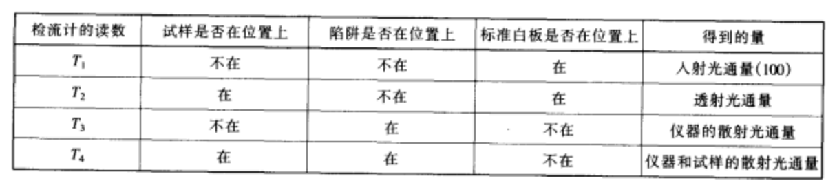 试样中,T1、T2、T3、T4都是测量相对值,无入射光时,接受光通量为0,当无试样时,入射光分部透过,接受的光通过量为100,即为T1;此时再用光陷阱将平行光吸收掉,接受到的光通量为仪器的散射光通量T3,若放置试样,仪器接受透过的光通量为T2;此时若将平行光用光陷阱吸收掉,则仪器接受到的光通量为试样与仪器的散射光通量之和T4。因此根据T1、T2、T3、T4的值可计算透光率和雾度值。