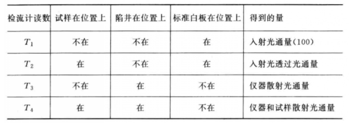999彩票 ③放置试样,此时透过的光通量在检流计上的刻度为T2,去掉标准板,置上陷井,在检流计上所测出的光通量为试样与仪器的散射光通量T4。再去掉试样,此时检流计所测出的光通量为仪器的散射光通量T3。以上测试如下表所示。
